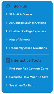 2. Info Hub. Like a one-stop shop, the Info Hub quickly links you to the information as well as calculators and tools you need to shape the 529 savings account that best suits your family’s needs. As you travel to the different stages on your college savings journey, the info hub will reflect the current information you will need.